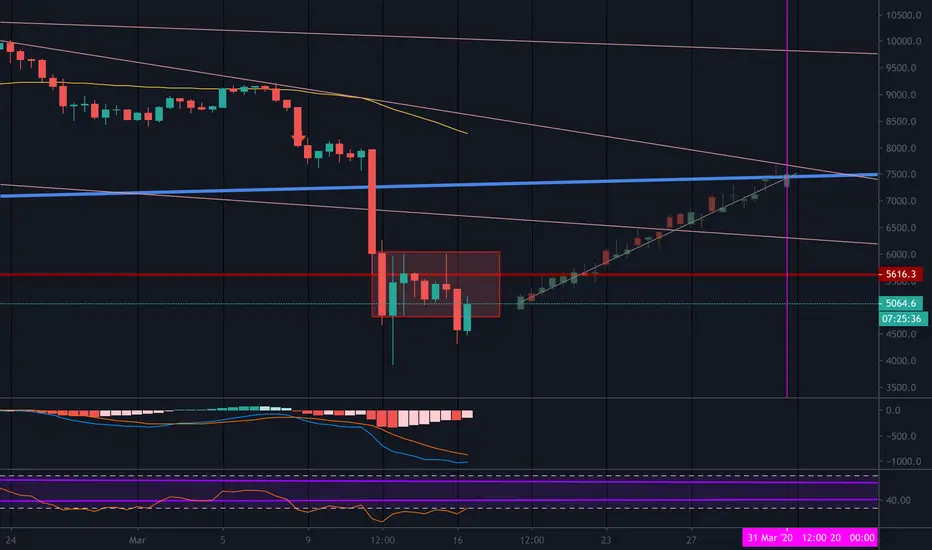 MACD is pushing upwards towards the 0 level. If we can get to positive and break above that trading range then the journey back to the long-term blue trendline does not seem so great by the end of the month. The purple vertical line indicates the end of the month. This would paint a strong monthly reversal candle and the bull run will be back on.