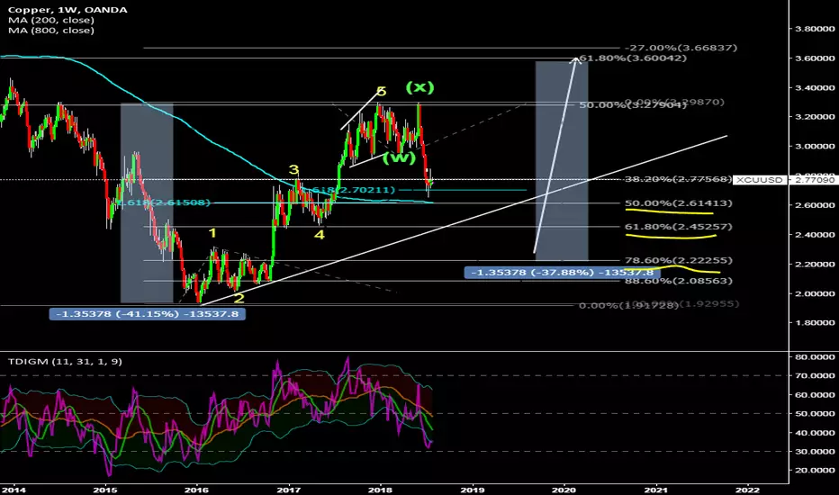 Copper counts and measures out to have done a textbook Elliot 5 wave impulse and is now in correction. Therefore, I would expect at least a 50-60% retrace. The 200MA on weekly and 800MA on daily appear to be fairly close to lining up with each other around the 50% retrace. Possibly a spot to get a buy setup for at least a small pullback. I think we should get another wave in order to turn this impulse wave into a 3 wave structure by the time it is finished. If we were to get a zig zag correction down to the 78% fib, then the 2.20 level should be of importance. I showed you equal length taking you back up to the .618 level. It came off the 1.618 extension of a small 3 move correction. Not necessarily a trade setup right this moment, just thought I would share the info.