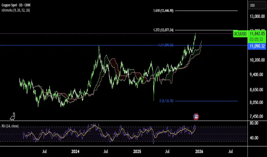 Copper prices on the London Metal Exchange have surged above 11800 USD marking a new all time high in global markets. Over the past year this metal has delivered a strong 30% return driven by concerns over supply disruptions and rising demand from electric vehicles and AI related infrastructure. The upward momentum suggests copper may continue setting new records.