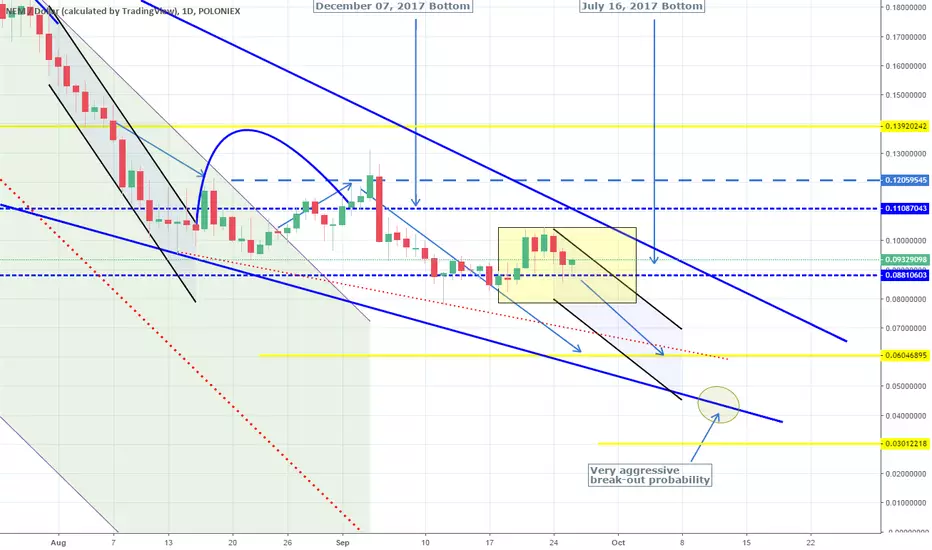 XEMUSD has made another Lower High on the 1W Falling Wedge (RSI = 36.374, MACD = -0.081, Highs/Lows = -0.0262, B/BP = -0.0796) staying bearish on the long term but neutral on the short term (1D RSI = 45.270, Williams = -53.449, CCI = -0.6358, Highs/Lows = 0.0000). This should create a consolidation phase within a 0.07855 - 0.1040 Rectangle until 0.7800 breaks. Our TP is intact at 0.060.