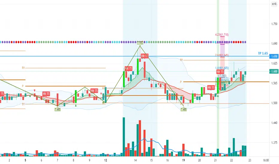Currently, price rebound from pivot point and close above EMA7. If price close above 1.60 , TP = 1.65.