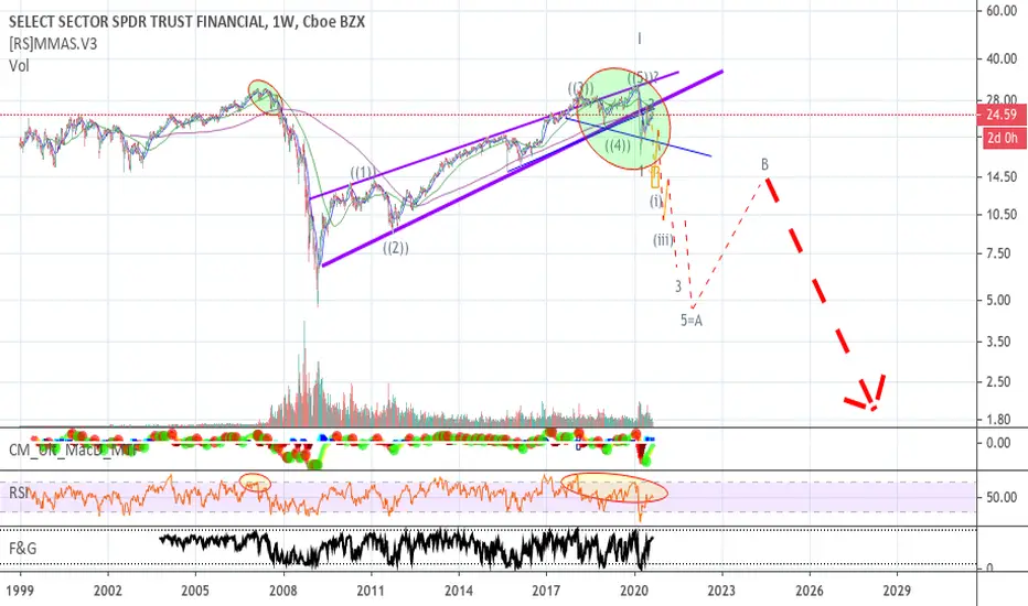 I will make one more attempt here to trace out the potential "super cycle" or "grand super cycle" bear market waves that I believe are still about to unfold. I am tired of the distortion caused by tech stocks in the S&P so will use the financial sector directly to try and map it out. Also, if markets truly continue to rise and disconnect from reality then I shall rest my case.