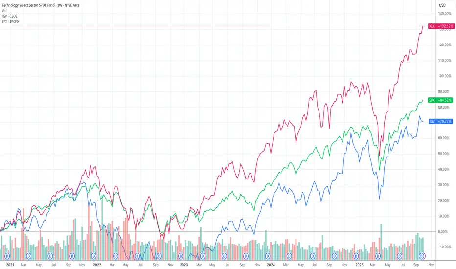 SPX based comparison between XLK and IGV. Hardware or software, just different period cycles. Who can dominate maket trends, lets see.