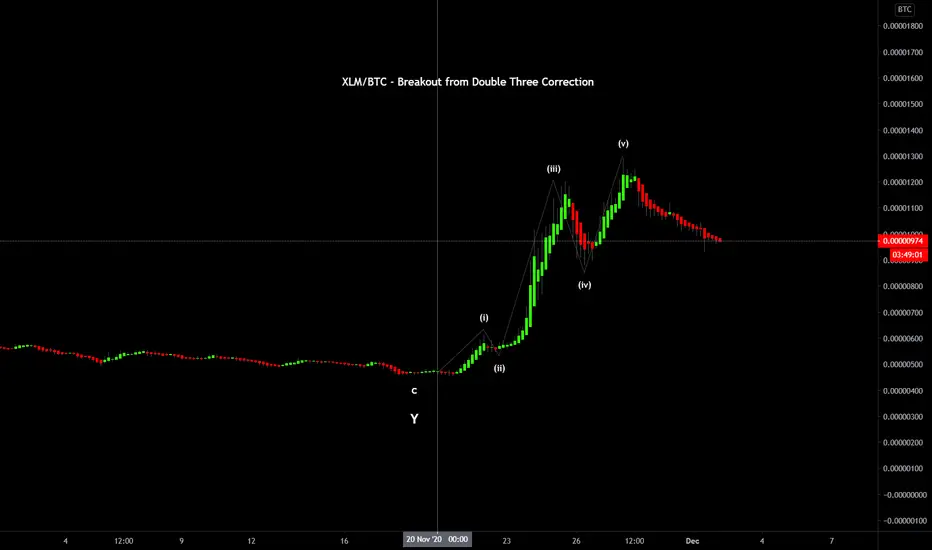 An update on XLM/BTC. It looks like a clear breakout from the Double Three structure with price breaking out from the zigzag into an initial five wave impulse of a smaller degree. Let's see how it plays out for confirmation.