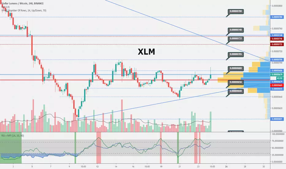 XLM moving sideway and accumulates volume, pushing all the moving averages up, towards uptrend. Sooner or later it should lift up and the target will be 750.