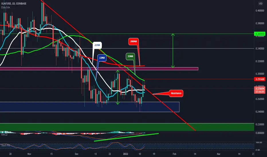 XLM got pushed down from the 55MA, it's currently between the 55MA and the 21MA, and could find support from the Red Extended Trend Line which was previous resistance.