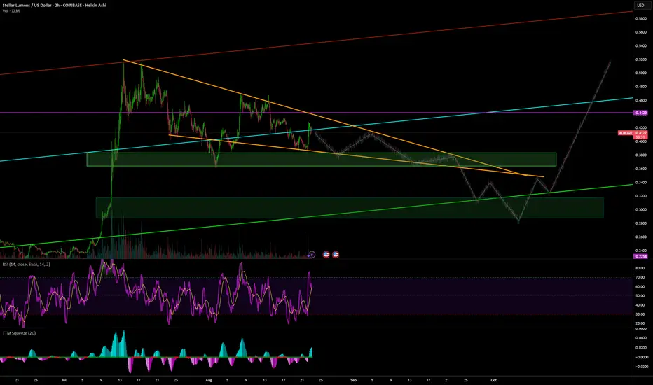 The first at .39 is the obvious (probably too obvious) entry. Break up from the descending wedge with target the top of the bullish channel.