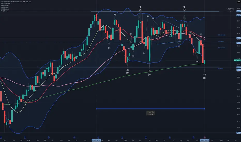 XLP: The sideways trend range that has lasted for over a year could be completed with a TZZ wave pattern. While the latest ZZ wave (C) fell somewhat short of wave (A), the weekly hammer candlestick, which has allowed it to recover above the 200-period simple moving average, is promising. There is a lot of upside work to be done to declare the TZZ completed, but given its sector's worst year-to-date performance, a rotation into defensive stocks would certainly propel this ETF higher.