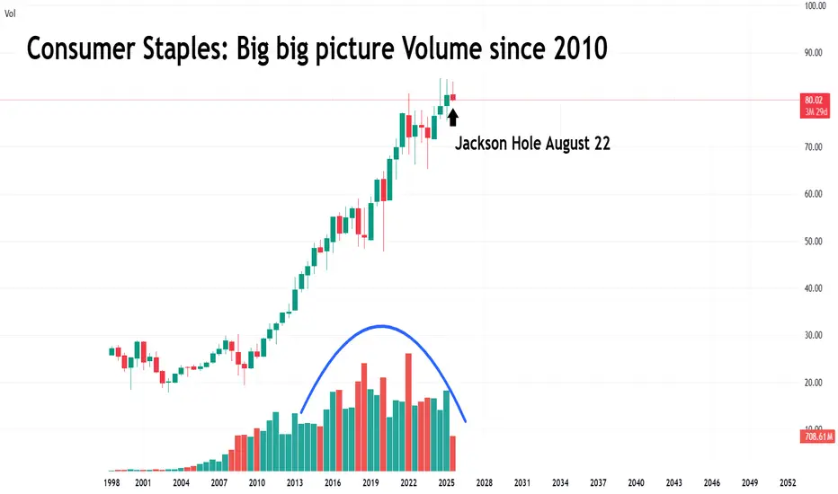 After Jackson Hole and the “announcement” of the upcoming rate cut, we saw a rotation into cyclical sectors at the expense of defensives. A rotation that came on declining volume. It caught our attention, so we went to look at the bigger picture of Staples. We found this trend confirmed by volume. We simply didn’t expect to see this chart. XLP over 6 months