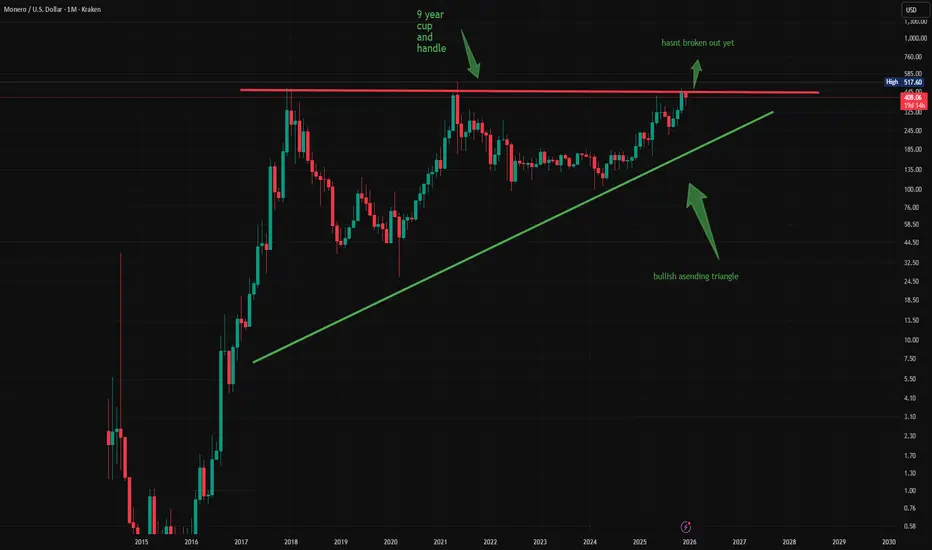 monaro has been out preforming every major coin out there.. btc is obviously in a bear market..as well as everything else but the one coin that is actually bullish is manero...from the high on btc we are down a crazy 26% more coming....ltc from high we are down a incredible 36%.. now xmr is only down 12% and is about to test a break out of this bullish ascending triangle..all indicator are bullish .. in short this looks like xmo has been forming a cup n handle just like silver for a incredible 9 years.. on regular scale 5 day, it does appear to be forming a inverted head and shoulders ..heres where things get interesting when we get conformation on the smaller time of a breakout this will explode and go parabolic. xmo would be the only crypto worth buying ,as soon as we get conformation i will immediately update you..hang on this possibly could be the next crypto silver..