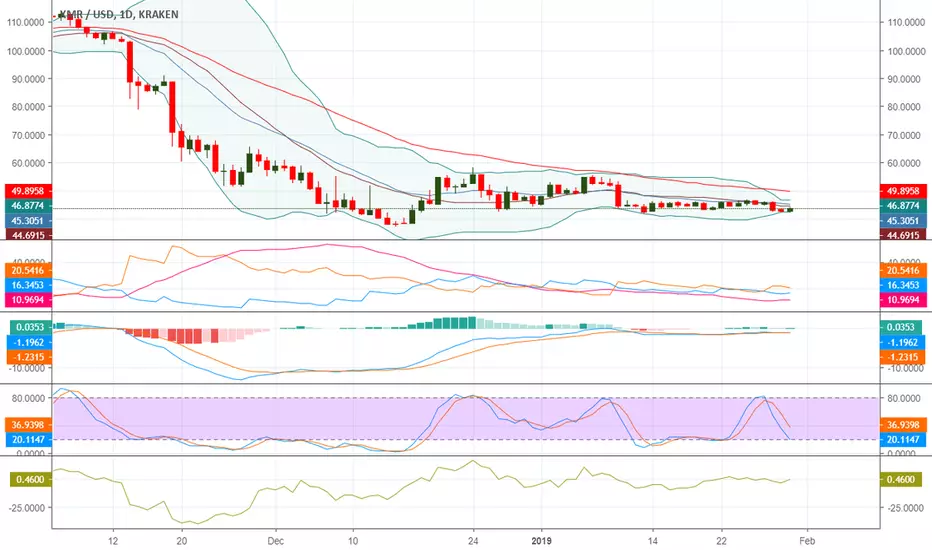 Between June and November 2018, the price of XMR was trading inside the horizontal channel created by 145 resistance and 80 support. It has since exited said channel and is approaching the long-term support at 30 which I consider to be the next target on a weekly chart.