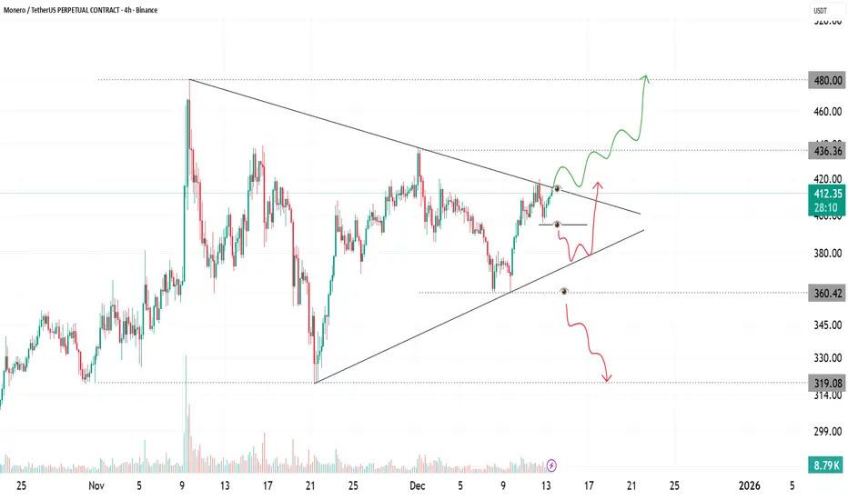 XMR is currently trading inside a well-defined symmetrical triangle, formed by a series of lower highs and higher lows after a strong impulse move. This structure reflects balanced pressure between buyers and sellers, signaling compression before a volatility expansion.
