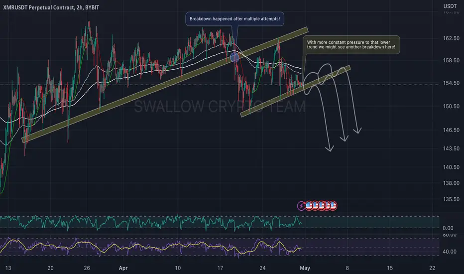 XMR/USDT has been testing that trend for a while now. With that being said we see a good chance for another breakdown to happen here which should look similar to the last one. Keep an on this one 😉