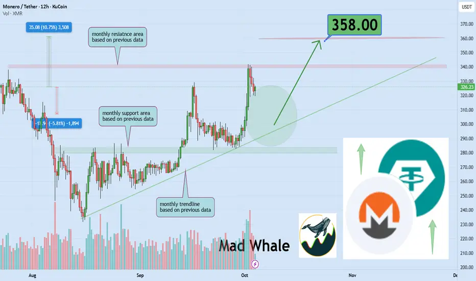 XMRUSDT is approaching a strong monthly trendline and support zone; holding this level and breaking above resistance could trigger a 10% rally toward $358. Traders may watch for bullish confirmation at these key levels. 📈💎