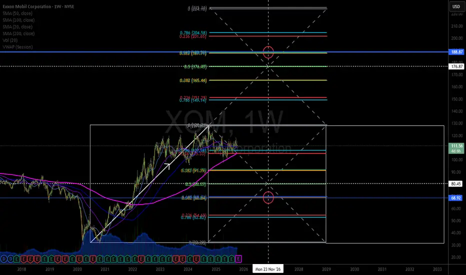 XOM Price targets for bulls and bears in to Nov 2026. In compression hits 188s, 149s seem reasonable at minimum. Each Fib is resistance and support.