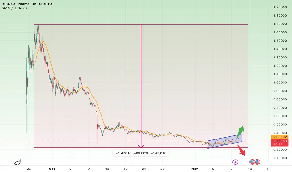 On the 1-hour chart, XPL has experienced a sharp decline of about 87% from its previous high to the recent low. After this steep sell-off, the price has entered a consolidation phase, moving inside a short-term ascending channel that indicates temporary stabilization.
