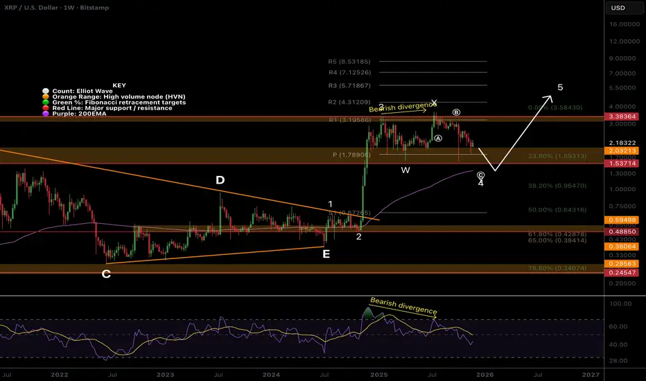 XRP Wave 4 appears to be a flat correction defined by the poke above the all-time high. Wave 4 is expected to end at the 0.382 Fibonacci retracement, also the weekly 200EMA ~$1.2.