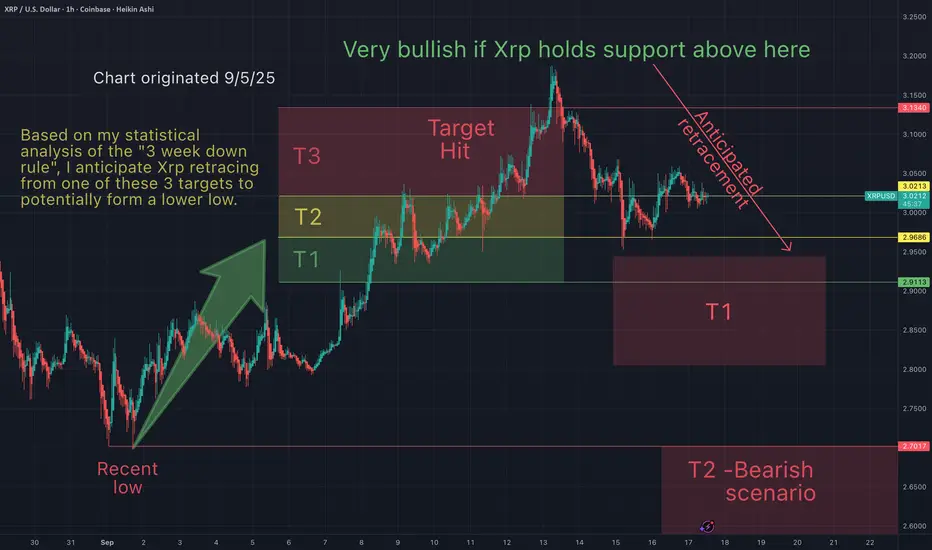 On Sept 5th I suggested that Xrp was bullish and heading up towards my take profit (T1-T3), then retrace.