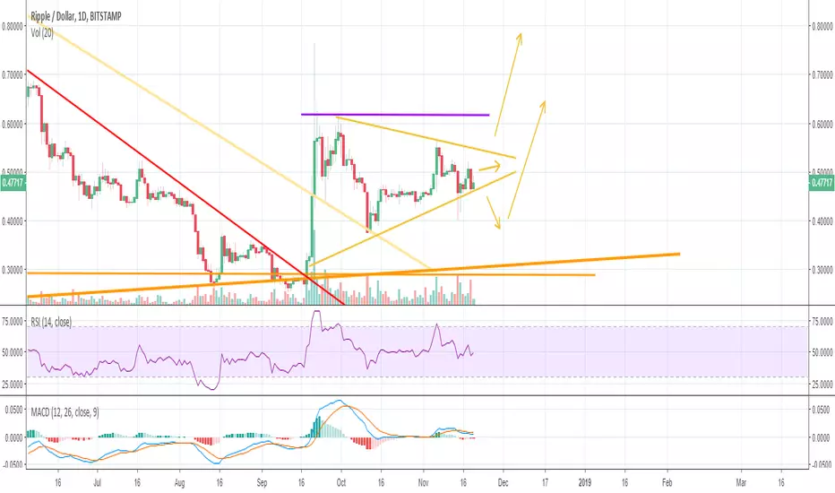 While everything has been taking a beating. Ripple hasn't. It's remained strong and price hasn't gone down. Because of this, this leads me to believe that the present possibility of a continuation triangle is rather high. We won't get any action till everything has calmed down, but we are poised to go to $1, if not $3 or more if we get a really large bull run.