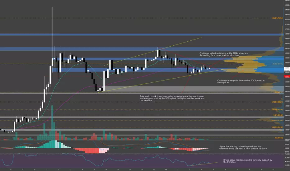 Ripple continues to remain pegged down by this supply zone and the EMAs as it tries to break out from that descending trendline. The lower trendline has been adjusted and we can see that it has tested near it multiple times and is now attempting to break past resistance and make its way back to the FIB level or the supply zone above.