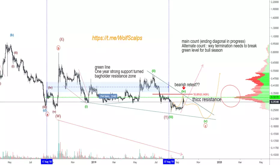 recent bounce only triple waves so it has to be corrective. If we dont break the green line/1D high value area of the VPVR then expect this ending diagonal to finish