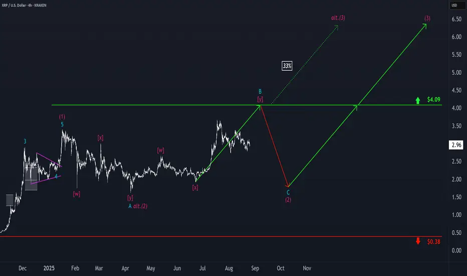 Under our primary scenario, we place Ripple’s XRP in a corrective rally, which should ideally conclude near resistance at $4.09, marking the peak of turquoise wave B. After this high, we anticipate a wave-C pullback, which should bottom out well above support at $0.38 – and establish the low of the larger magenta wave (2). Looking ahead, magenta wave (3) should then drive a sustained move above the $4.09 threshold. Be this as it may, if the altcoin surpasses this resistance level in the current leg, that will indicate that wave alt.(2) has already completed (probability: 33%). In that scenario, we would expect a direct breakout.