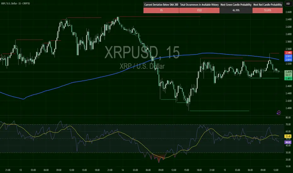 XRP trades near $2.50, consolidating just under the SMA200 ($2.53) after momentum cooled from the $2.55 zone. RSI at 48 signals balance, but repeated failures at resistance tilt risk lower.