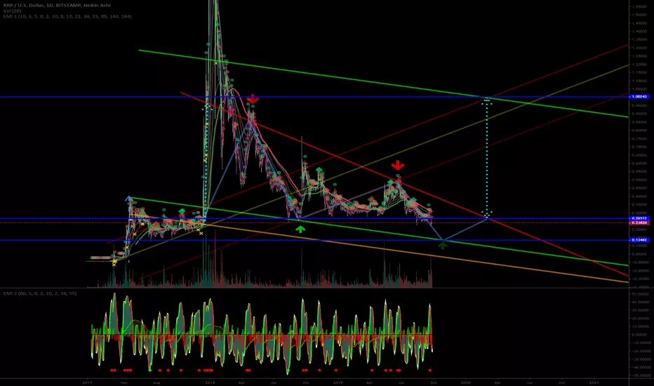 If XRP bounce of the support rejecting the bears with a vengeance and heads towards $0.26 resistance and breakout through the upside, then omg! XRP might possibly be going to $1.00 region!?!?!!!!(See dotted extrapolation). Regardless that descending triangles are most probable to breakout to the upside, past indications doesn't have to be future results, XRP breaksout at $0.13, then you might wanna consider to cashout. But once the lower low is confirmed there is still hope for the XRP project. Hold your tits XRP army!