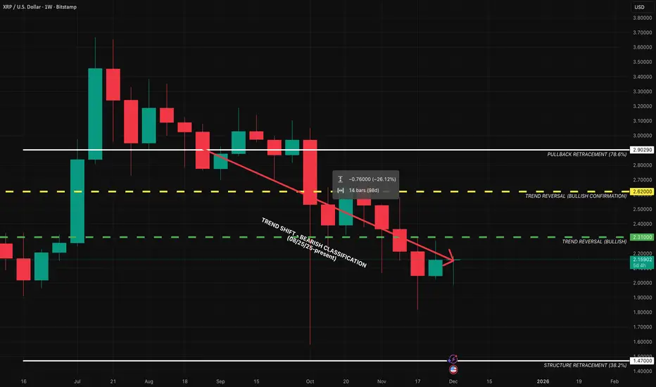 This is a reactive structural classification of XRP based on the weekly chart as of this timestamp. Price conditions are evaluated as they stand — nothing here is predictive or forward-assumptive.