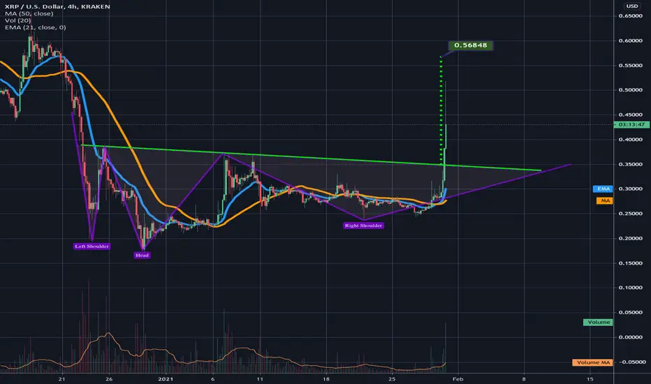 the 4hr chart ugly inverse h&s we had been watching several ideas ago waited until the very last us exchange (kraken) had suspended trading before finally confirming the breakout of this pattern...target should be around 56-57 cents. How convenient for them to wait untl the day after kraken halts trading to breakout.