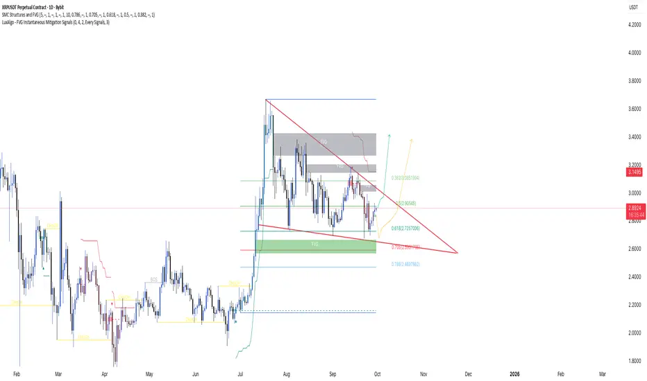 Trend is corrective after the July impulse, printing lower highs inside a falling wedge. Internal structure is bearish-to-neutral, but compression suggests energy building for a break. Price sits mid range near the 0.5 retracement, with external liquidity resting above 3.05 to 3.15 and equal lows below 2.55 to 2.47. A daily break and hold above the wedge top would mark a change of character back to bullish; a sweep into the lower green box keeps the larger uptrend corrective.