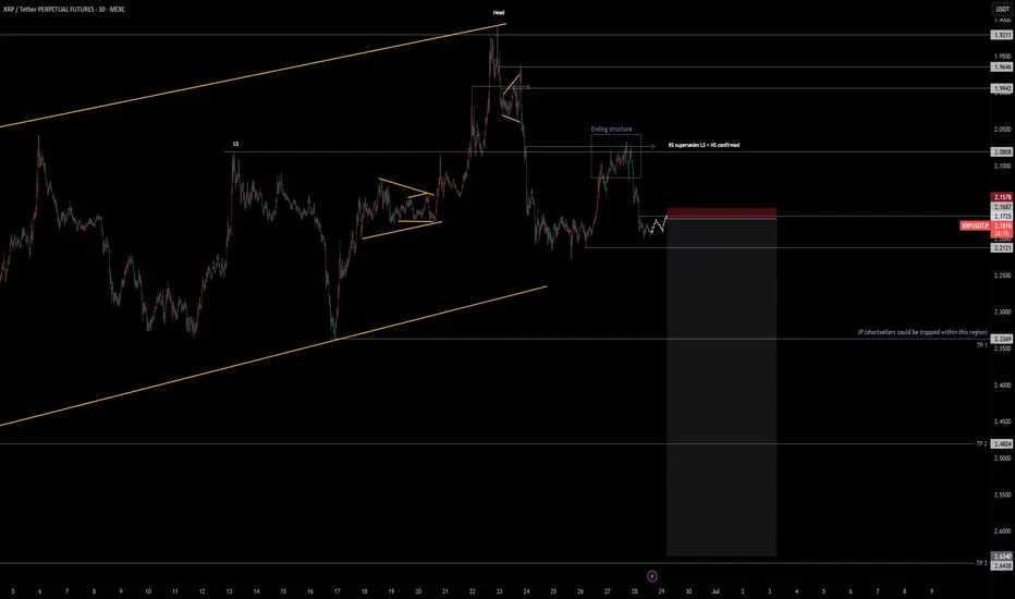 Price action has respected a key volume area (VA), and the Head & Shoulders pattern is playing out nicely — each inflection point is being taken out. I'm patiently waiting for a potential LTF flag (correction) to form.