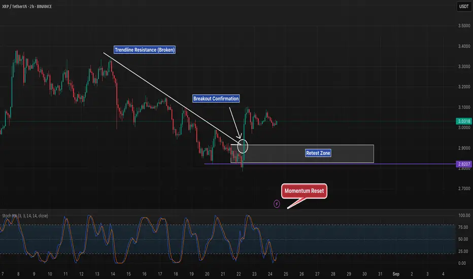 XRP has broken out of its short-term descending trendline, with a strong impulse candle confirming the move. Price is now consolidating just above the 2.82–2.90 retest zone, making this a critical level for continuation.