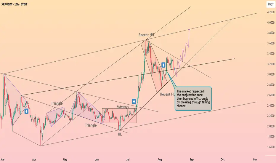 XRPUSDT broke out of a falling channel, bouncing off the conjunction zone and maintaining a higher low structure. Bulls are targeting the $3.80 level while defending $3.20 support.
