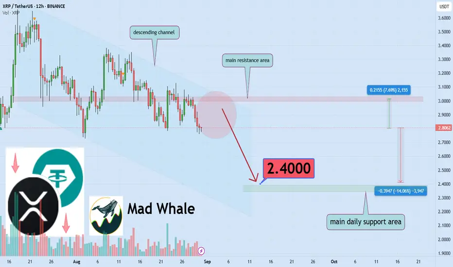 XRPUSDT is currently trading within a clearly defined descending channel 📉, facing strong daily resistance. A pullback of at least 14% is likely, with a target near 2.40💰.