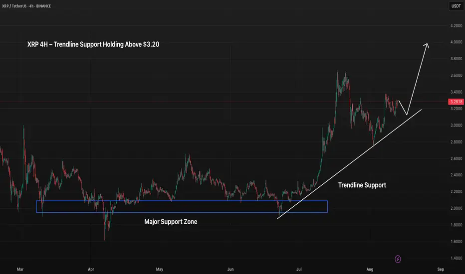 XRP continues to hold its ascending trendline from early July, maintaining $3.20 as a key pivot level. The $2.00–$2.20 zone remains the major long-term support after the breakout in mid-July. Price action is forming higher lows, with bulls targeting a breakout above $3.40 to open the path toward the $3.80–$4.00 range. A breakdown below the trendline could shift momentum toward $3.00 and potentially deeper into the $2.50 zone.