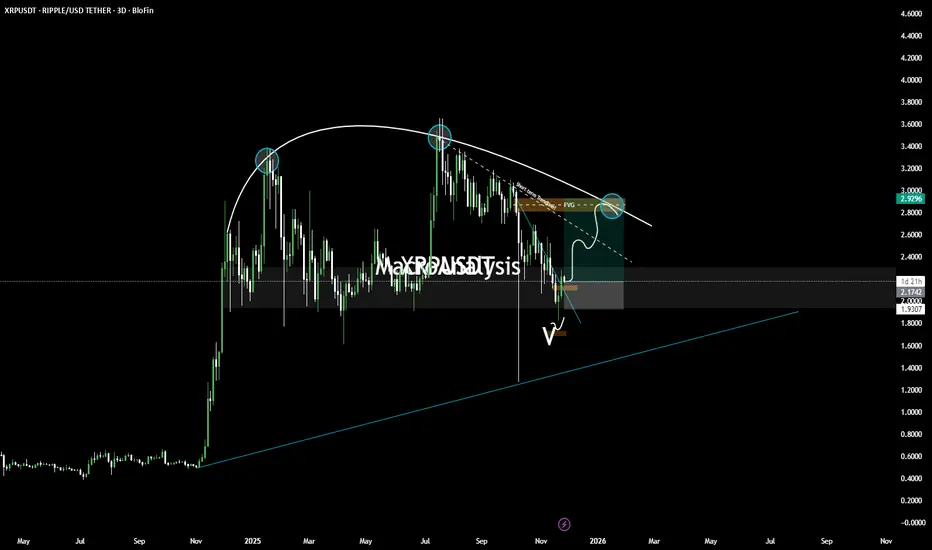 XRP is completing a long-term structural pattern that has been developing for months. This setup includes a rounded top distribution, a full breakdown into major demand, and a potential reversal structure forming at the bottom.