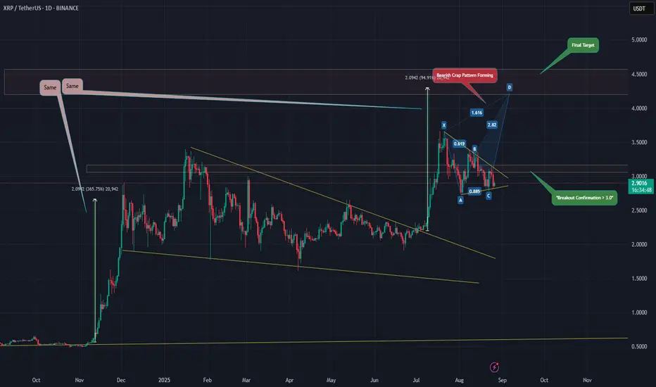 XRP is forming a Bearish Crab harmonic pattern, with price currently consolidating inside a triangle structure. A breakout above the $3.0 level would confirm the move toward the completion of point D.