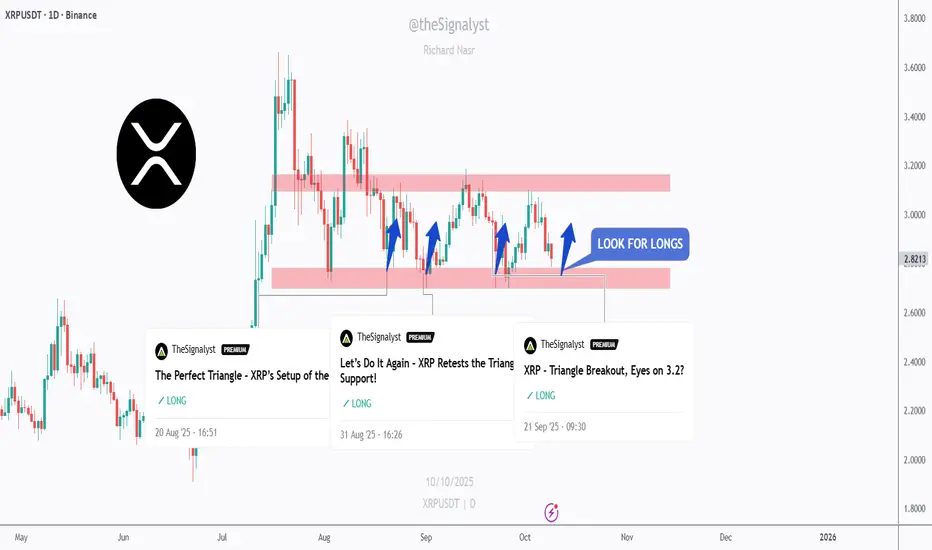 XRP is once again retesting its daily support zone around $2.60–$2.80, the same level that triggered multiple bullish impulses in recent months.