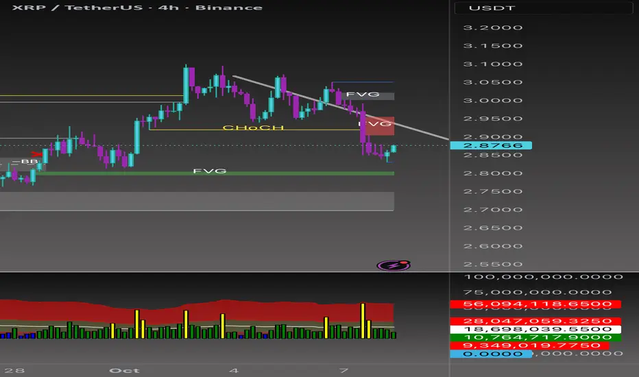XRP stuck between โ๏ธ Accumulation ($2.80โ$2.85) and ๐ฐ Distribution ($3.00โ$3.10) zones.