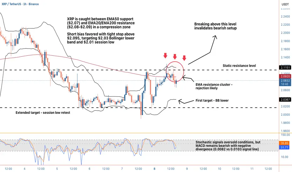 Hey guys, XRP is navigating a tight compression zone on the 1-hour timeframe, trading at $2.07 and caught between critical moving average levels that are setting up a potential directional break. Price is sitting right on the EMA50 at $2.07, which has been acting as immediate support, but overhead we've got a resistance cluster formed by the EMA20 at $2.08, EMA200 at $2.09, and HMA55 also at $2.09. That's a lot of technical density above current price, and the repeated rejections from this zone over the past several hours suggest sellers are defending it aggressively. The 24-hour range spans from $2.01 to $2.12, and we're currently positioned in the lower half, about 6 cents off the highs and 6 cents above the lows.