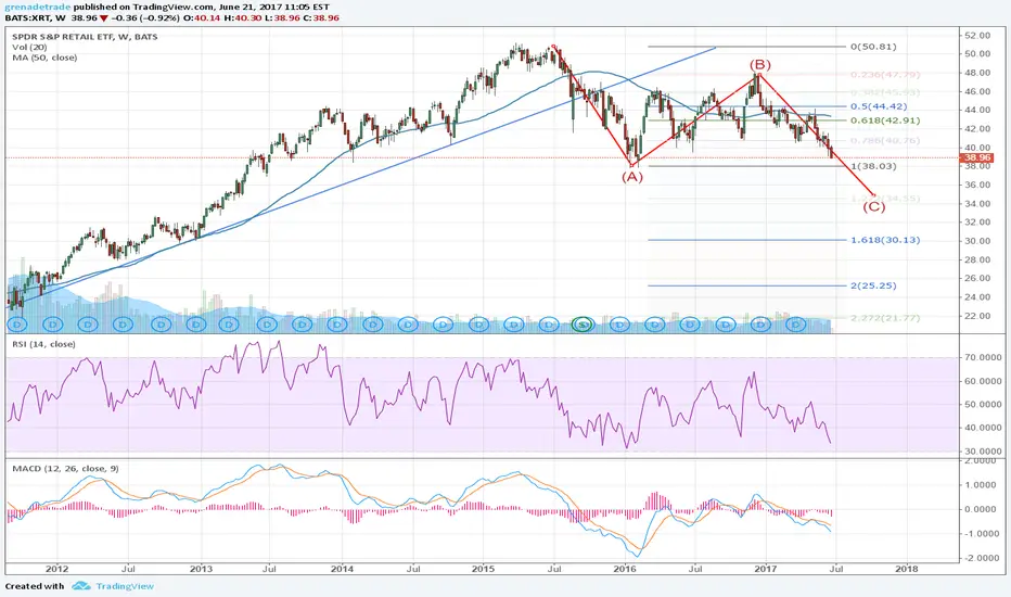 XRT has been in a ABC corrective Elliot Wave pattern. We see that in the very near term, it will look for support in the $38 area, which was the low and end of wave (A) as shown in the weekly chart below, moved up to the 0.786 fib level before starting it’s final wave (C) downward, which we’re currently in. It may get support at $38 but if that fails to hold, it’s projected to go down to around the $35 level and completing this corrective wave. Now, this may turn out to be more than a corrective wave and turn in to a longer term motive/impulse wave, but it’s too early in the cycle to see at this point which way that’s bound to go, whether to the upside or to the downside. Technicals show a bit more room left to the downside at current conditions.