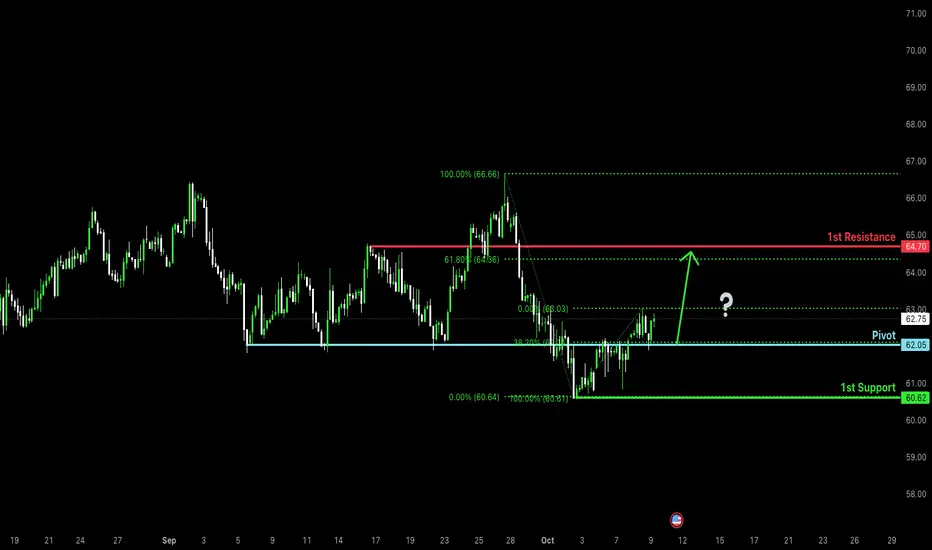 WTI Oil (XTI/USD) has bounced off the pivot, which has been identified as an overlap support that lines up with the 38.2% Fibonacci retracement and could rise to the 1st resistance.