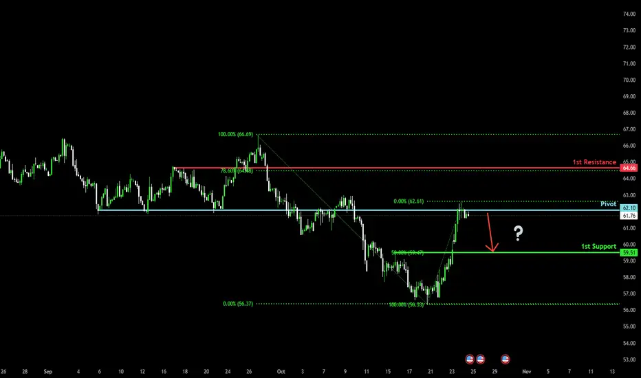 WTI Oil (XTI/USD) is reacting off the pivot whic acts as an overlap resistance and could drop to the 50% Fibonacci support.