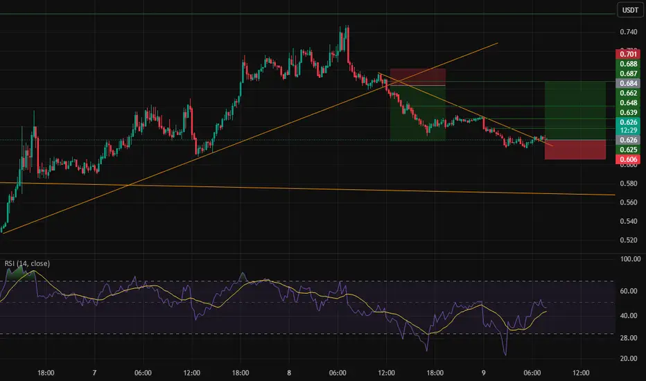 XTZ is currently rebounding from a strong support level near 0.615, forming a bullish reversal pattern on lower timeframes.
