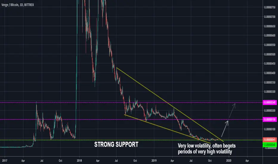 This is a great entry point in my opinion for XVG. Looking at the daily chart, we can see the price has remained above a historical support area for the last 4 months. This is likely an indication that the price has bottomed and will go up from here. In addition to the price finding support, the volatility has been extremely low. Low volatility often begets high volatility. This is key as it approaches the upper resistance boundary of its falling wedge. The price will be forced to move up through resistance or down through support. XVG is one of the few alts that has made any moves upwards. When I add up all the facts 1) Price has been propped up by strong support for 4 months 2) Extremely low volatility 3) Nice rounded bottom 4) Price is being forced to move up or down - I have a feeling that XVG may have a very strong bull run soon. I am buying here and can set my SL just below support. The risk reward ratio is huge to the upside.