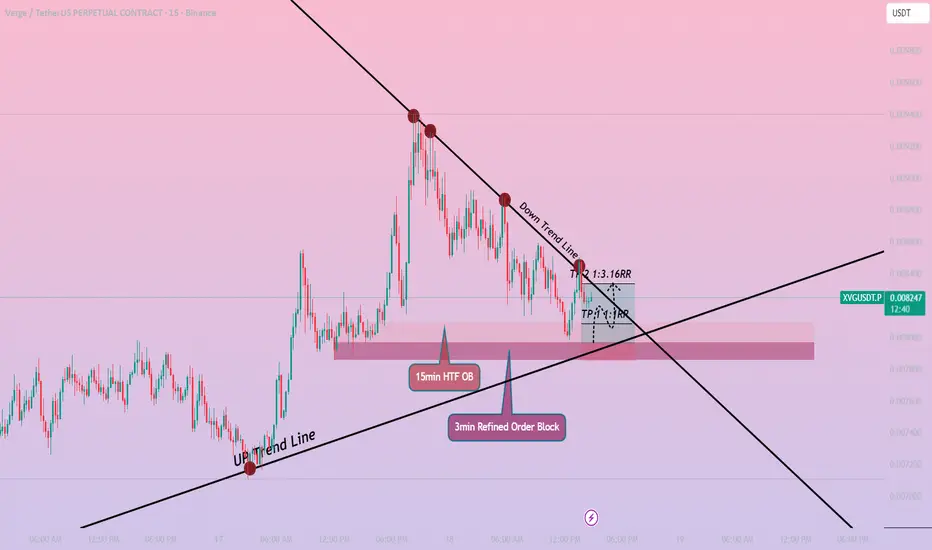 In this XVG/USDT setup, the market is showing a clear HTF bullish structure on the 15-minute timeframe, while the LTF (3-minute) is still in a corrective downtrend. This type of HTF–LTF mismatch usually indicates that the market is searching for liquidity before aligning back with the major trend.