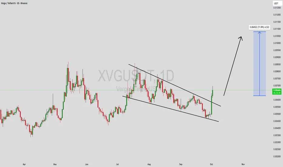 XVGUSDT is forming a falling wedge pattern, a well-recognized bullish reversal signal in technical analysis. This structure indicates that selling pressure is gradually weakening while buyers are starting to gain momentum. With consistent volume supporting the move, the probability of a strong breakout is increasing, making this pair an attractive setup for traders looking for medium-term opportunities.