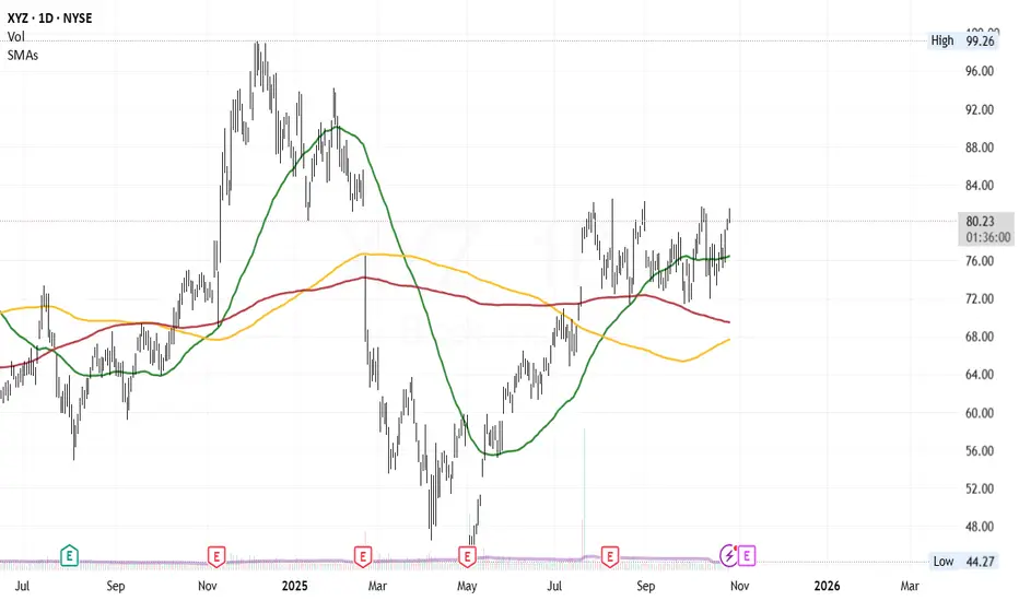after a surge of price and then a long consolidation phase, XYZ may burst through the 82.44 resistance and go on a rally. the recent 50\200 MA semi-golden cross and the likely upcoming 150\200 MA golden cross are making the bullish speculative more likely.