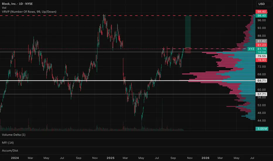 Within this broad consolidation, the price has repeatedly reacted to the $81–$82 level. Recently, after a sharp rally from $45, the stock is now consolidating right below this levela, forming a bullish flag pattern.